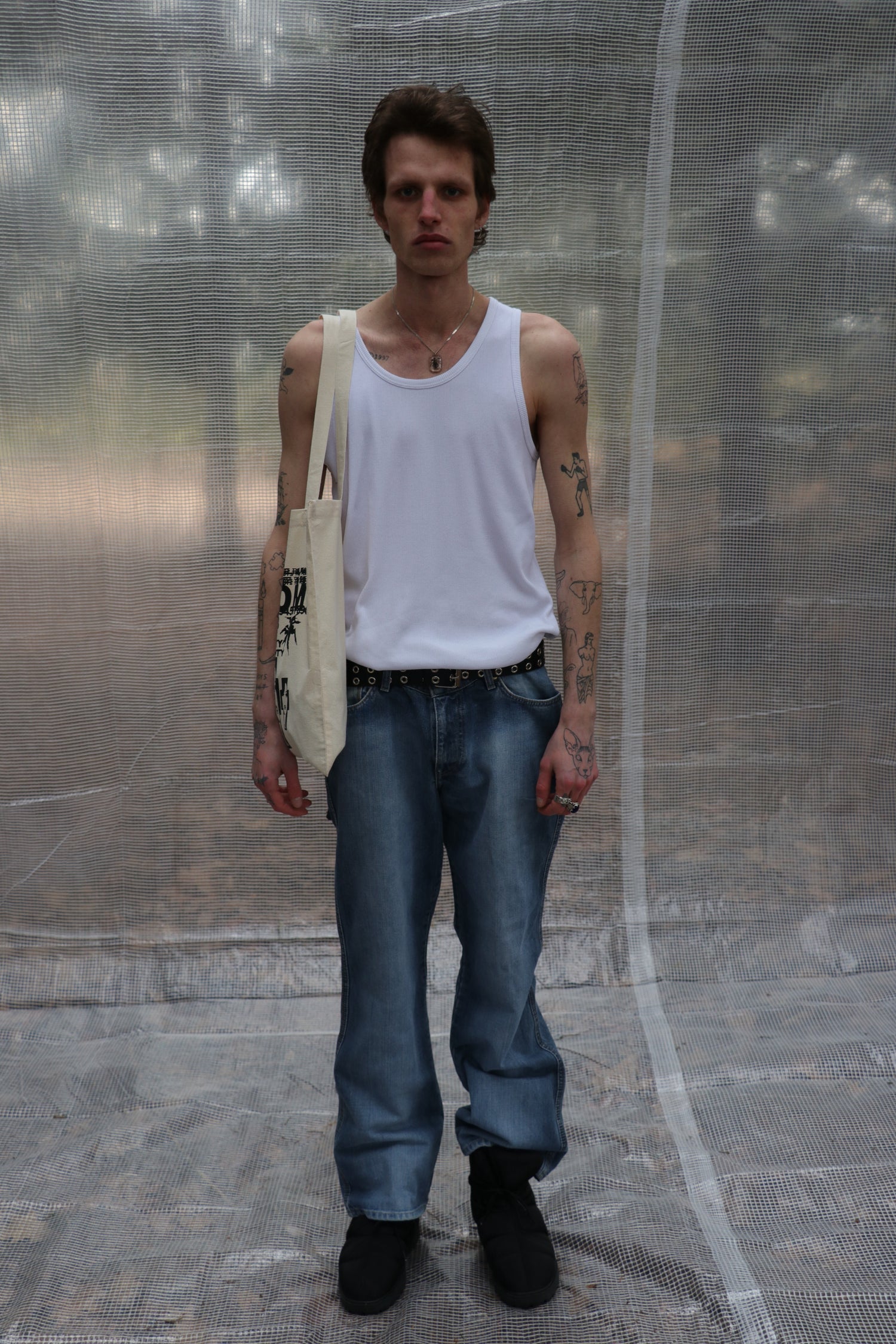 - blue Jeans with a back print and bags